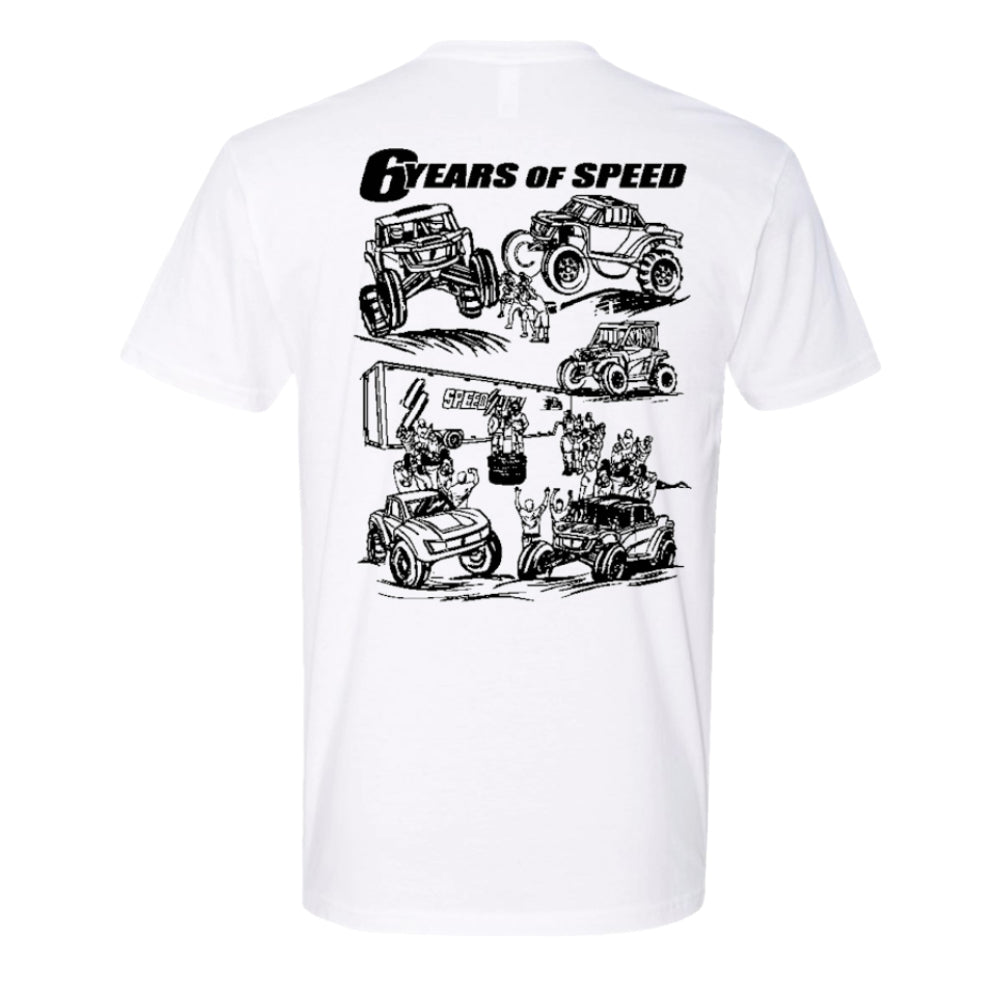 Celebrate six years of SPEED UTV in style with this limited-edition tee. Featuring a bold black “S” logo on the front chest and a “6 Years of Speed” cartoon graphic on the back, this shirt is the perfect mix of classic and eye-catching.
